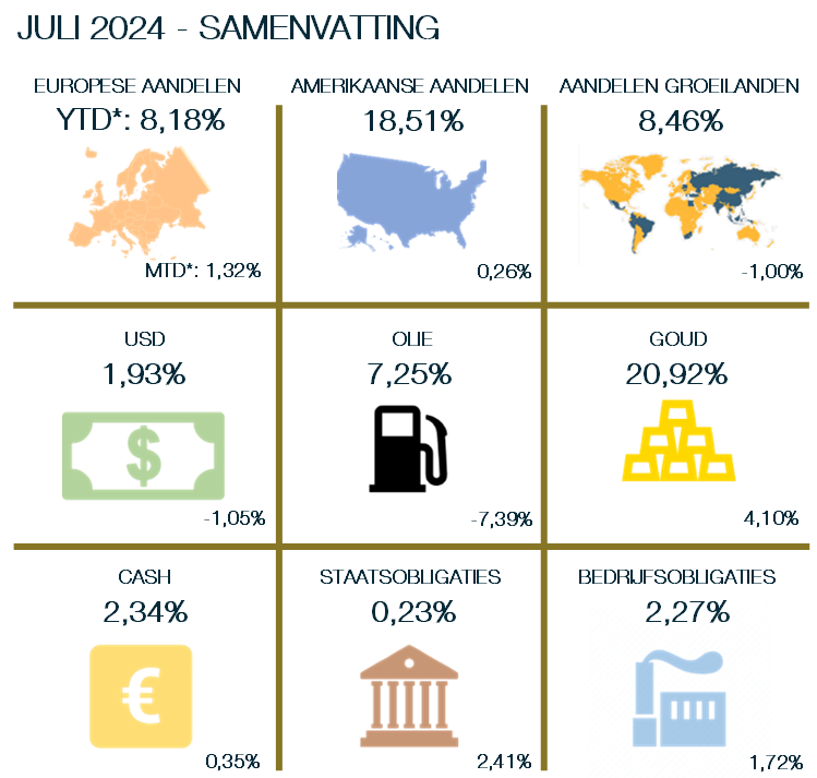 Ook de politiek beroerde de markten. In Frankrijk eindigde een gevreesde overwinning voor extreem rechts of links in een erg verdeeld parlement. Een mislukte aanslag op presidentskandidaat Trump deed zijn overwinningskansen stijgen. Al besliste president Biden om zichzelf niet meer verkiesbaar te stellen ten voordele van vicepresident Kamala Harris.