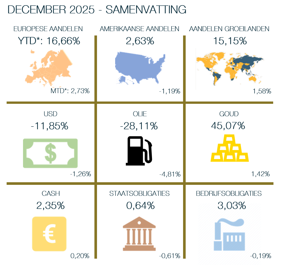 December 2025 vormde daarmee een meer evenwichtige en positieve afsluiter van een bewogen beursjaar. De combinatie van voorspelbaarder monetair beleid, afnemende inflatiedruk en een stabieler macro-economisch kader, bood steun aan het beleggersvertrouwen, zonder dat de onderliggende onzekerheden volledig verdwenen. Met deze achtergrond gaan de markten 2026 in met een voorzichtig optimisme en blijvende aandacht voor economische data en beleidsbeslissingen.