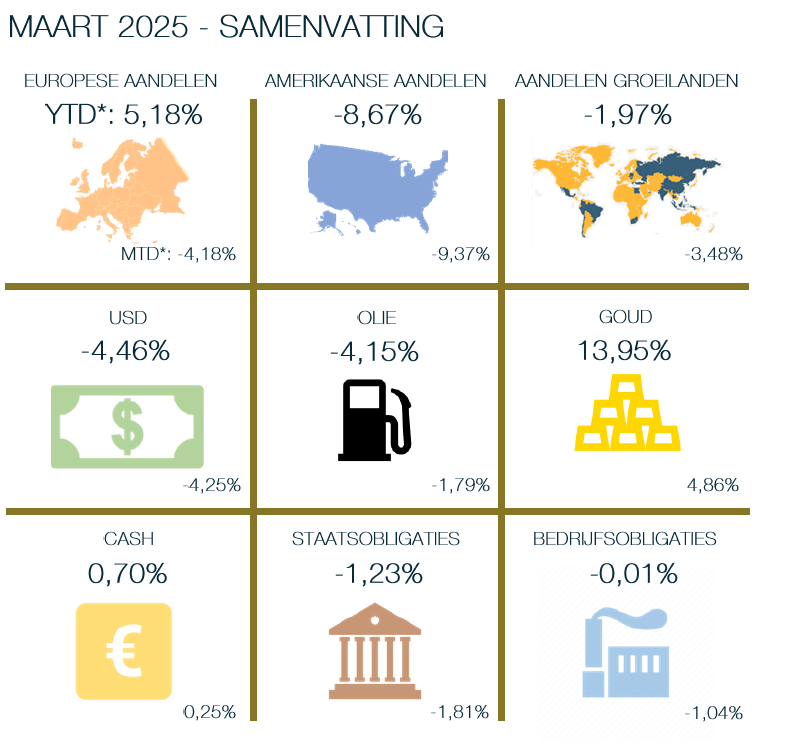 Na een turbulent eerste kwartaal sloten de financiële markten maart met een overwegend defensieve toon af. Wereldwijd verschoof het marktsentiment richting voorzichtigheid, ingegeven door geopolitieke spanningen, toenemende zorgen over stagflatie en tegenvallende economische signalen uit de Verenigde Staten.