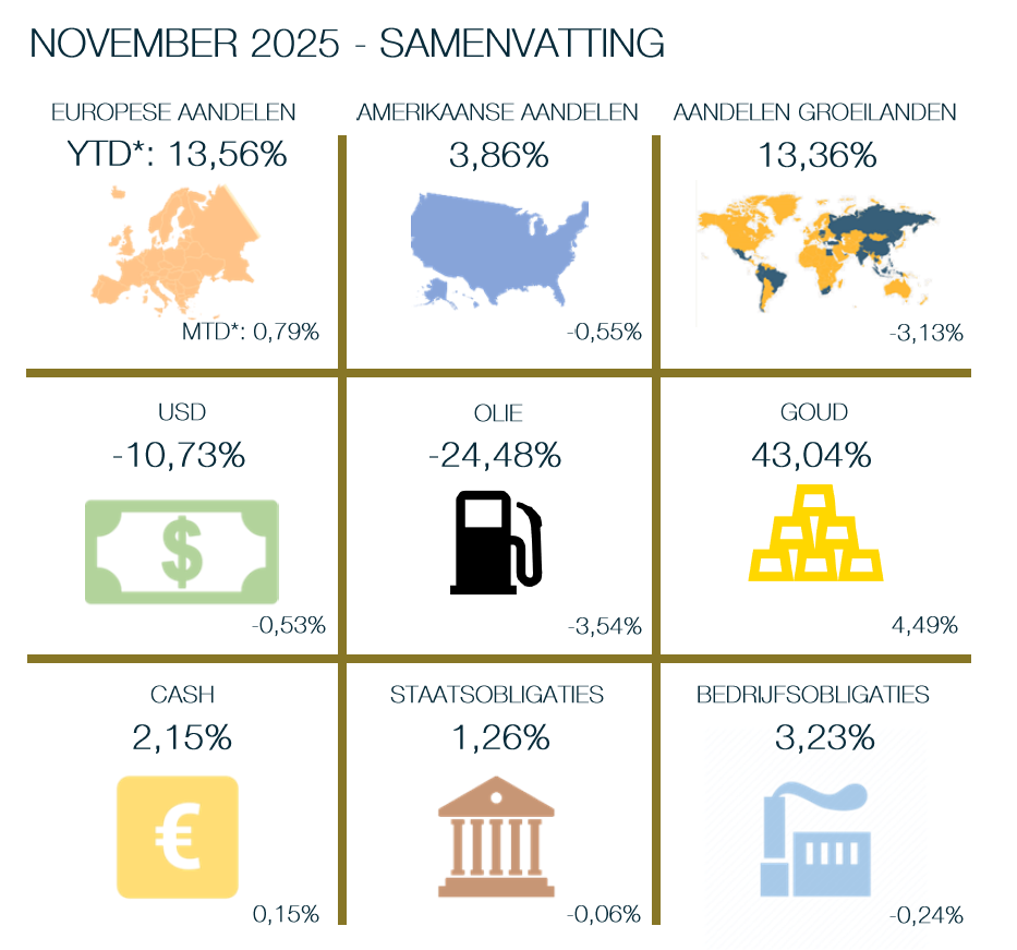 Samengevat werd november gekenmerkt door twee marktfasen. Na een zwakke start herstelden de markten krachtig, ondersteund door hernieuwde verwachtingen rond monetaire versoepeling in de Verenigde Staten en voorzichtig optimisme over geopolitieke ontwikkelingen. Tegelijk bleven zorgen rond een mogelijke AI-bubbel en de scherpe terugval van de bit-coin de volatiliteit verhogen. De relatief sterke prestatie van Europese activa benadrukte dat regionale factoren opnieuw meer gewicht krijgen binnen het globale marktsentiment richting het jaareinde.